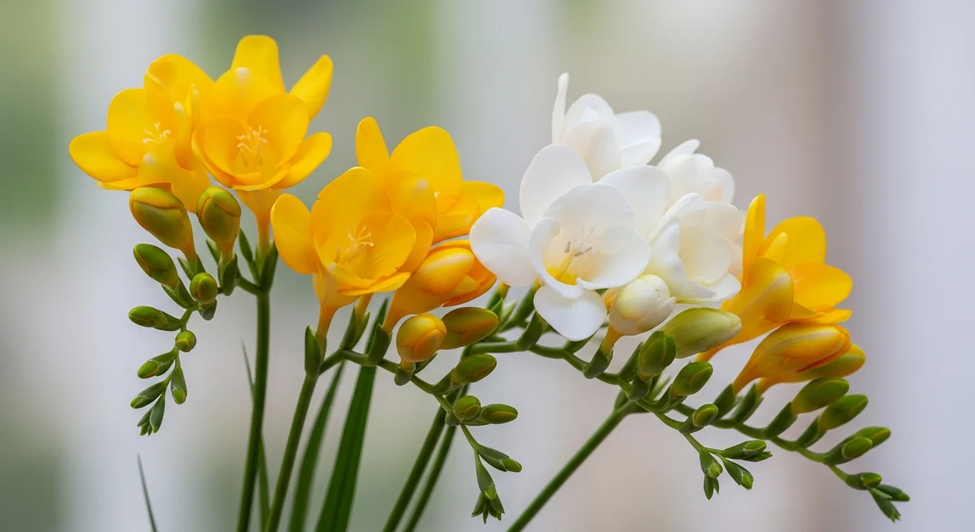 日常のちょっとした贈り物 — フリージアは花束にしても鉢植えにしても手頃な価格で手に入ります。特別な理由がなくても、「いつもありがとう」の気持ちを込めて気軽に贈れる花です。